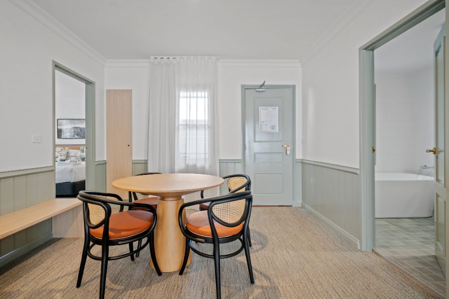 After a day in the wilderness and exploring the natural wonders, retreat to your stylish Moreton room for the evening. Relax and unwind in the street front room with views of the old-world charm inspired village and the mountains beyond.